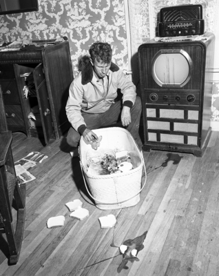 This is part of the debris and damage left by vandals Sunday afternoon at the home of Mr. and Mrs. Francis L. Sewall. That's syrup, eggs, bread, and broken dishes on the floor.