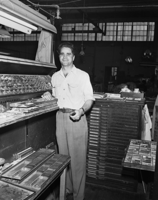 Compositor Barton McCans returns to work after winning Class B singles crown. Published in Fort Worth Star-Telegram, morning edition April 18, 1950.