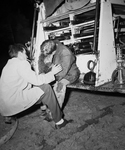 An unidentified spectator comforts Villotti Novak, fireman from Station 12, right, who was prostrated by the furious heat of the pipeline fire in North Fort Worth Monday night. Novak returned to the firefighting line after 15 minutes rest.