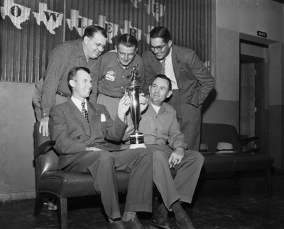 Dr. Travis Lanham and Jerry Long hold Panther City Office Supply's Class B trophy. Back row, are Homer Abel, M. H. Tempelmeier and Weary Hoelzel. Published in Fort Worth Star-Telegram, morning edition April 18, 1950.