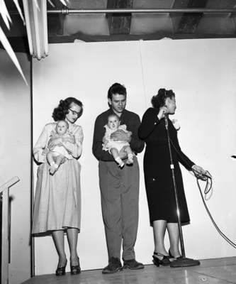 Linda Roncone, 3 months, daughter of A/2C and Mrs. Louis Roncone. Baby Roncone competed in the beauty contest Tuesday afternoon in Leonard's Toyville. Her father is holding her.