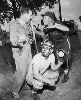 Shortstop W. E. Barnes, right, who doubles as a Dallas Motorcycle officer, found argument useless against the umpire, Fort Worth Detective Roy Hilts. The home team catcher, Radio Patrolman H. W. (Dude) Jordan, knew the outcome. But the visitors finally won, 15 to 7. Published in Fort Worth Star-Telegram, morning edition June 9, 1950.
