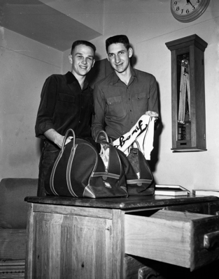 Sonny Lampkin, left, and Ray Warren, pair of sophomore starters for Texas Christian University cage team, complete packing before departure for Manhattan, and National Collegiate Athletic Association Regional Tournament.
