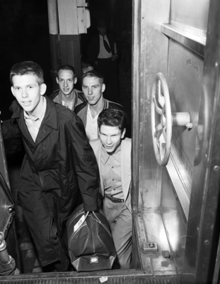 Vergil Baker, Charles Warren, Henry Ohlen, and Ross Hoyt left to right, board train late Wednesday for Manhattan, Kansas. All members of the TCU basketball team.