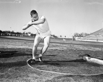 Buddy Oujesky, Steer weightman, prepares to slide across the ring and let fly with the shot. the junior 200 pounder was third in the 1952 city meet.