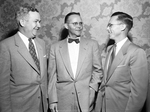 John W. Norris center, of Marshalltown, Iowa, president of the Lennox Furnance Company, talks with City Councilman Ed Baker, left, and Jack Melcher, Southwest manager for Lennox, during Norris' inspection tour of his Fort Worth plant. He was honored at a luncheon at Hotel Texas.