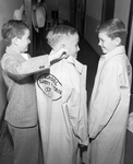 Burton Cole, left, sixth grade student at Ridglea West Elementary School, helps Freddy Cook of West Van Zandt, into a new safety patrol raincoat. Wayne Hidler, right, of Ridglea West models a coat given the schools by West Side Lions Club members.