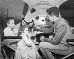 Dick Montgomery of St. Louis, right, who is traveling with the Ralston rocket ship, explains the flying controls to two patients at W. I. Memorial Hospital Center for Children. The youngsters are Cyril D. Findley, 10, son of Mr. and Mrs. C. W. Findley of Bangs, and Dian Hopper, 3, daughter of Mr. and Mrs. Jack Hopper.