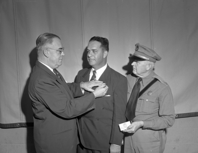 Colonel Homer Garrison, left, director of the Department of Public Safety, confers an award from the National Safety Council on Felix E. Webster, state highway patrolman from Decatur.