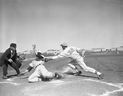 Leslie Mattison, TCU outfielder, slides safely into home plate ahead of a tag by Baylor's Billy Mac Gresham, but it's all for nothing. Umpire Lefty Johns waved him back to third on ground rules, since an overthrow was involved. It happened in first inning of Saturday's game here, which the Bears won by 7-4.