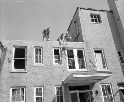 Workmen inspect a shattered electrical connection at Knox County Hospital, where 27 patients miraculously escaped injury Friday afternoon when the tornado hit the building. Damage to the hospital was estimated at $250,000. Most of the roof was ripped off.