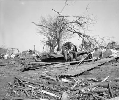 Surrounded by wreckage of the Knox City tornado, two small boys play, unaware of what has happened. But as far as they can see, houses are either badly damaged or completely blown away. Where the boys play was once a residence.