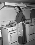 Martha Logan, who will open her 4th annual Homemaker's Cooking School at Leonard's demonstrating stove.