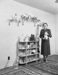 Mrs. Ferne Whiteman Smith holds "Lily Dache," gift of her brother, Paul Whiteman, and one of the starters in her collection of 170 cats, only part of which are shown in the photo. Siameses on glass shelf, center, are prizes of collection.