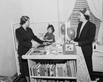 Mrs. Heard L. Floore, left, and Mrs. Rice M. Tilley, right, members of the auxiliary group, operate the bookmobile at Cook Memorial Hospital Center for Children.