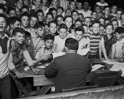 Deloyce Paulk, Don Messick, Joe Dale Selman, Jerry L. Wright, Dan Coates and Bobby Sheffer, left to right on front row, and more than 200 other boys receive instructions from Glenn Wilcox, foreground, at junior boys' baseball meeting at recreation Building.