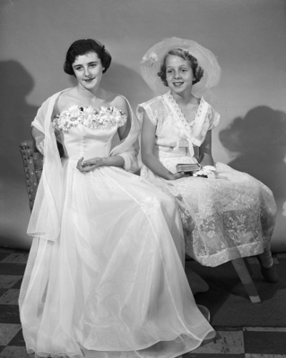 Stephanie Boylston, left, is shown sitting next to Betsy McIlheran. The two girls are dressed in formal attire, and would be models at a Style Show, that was staged by the Young People's Fellowship of All Saints Episcopal Church. The two are wearing clothes from Town and County, and Seven to Seventeen Shops respectively. Published in the morning edition, April 19, 1950.
