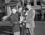 Cadet Captain Mickey Kavanagh receives trophy from Edward F. McCloskey. Sergeant Charles Moores stands next to Kavanagh and Sergeant Jan Ferris next to Moores.