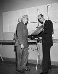 North Texas State College (NTSC) art department faculty members, Rudolph Fuchs, left, and Ray Gough, right, are shown discussing the attributes of design in a dough tray, that was borrowed from the college's State Historical Museum for its show; "Useful Objects" that was held in the Fort Worth Art Association gallery at the Fort Worth Public Library.