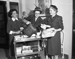 At Saint Joseph's Hospital, auxiliary members operate a rolling coffee cart for visitors such as Mrs. J. E. Gibbon, left, for whom Mrs. J. F. Lilley pours coffee, center, and Mrs. W. P. Henley offers doughnuts.