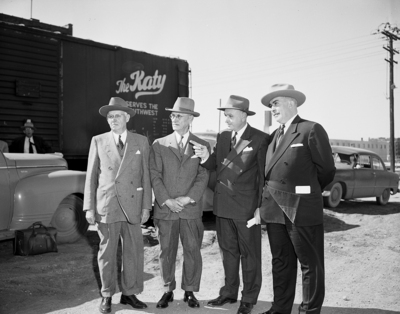 R. K. McDonald, general freight and passenger agent for Missouri-Kansas-Texas Railroad in Fort Worth, third from left, points out facilities of the railroad here to visiting Katy officials. Left to right are F. B. Griffin of Dallas, C. E. Veatch of Saint Louis, McDonald and O. H. Griffin of Dallas.