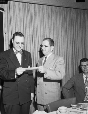 Lowell Hudson, left, administrator of City-County Hospital, accepts a check from S. C. Alley, president of the Fort Worth Sertoma Club. The money will be used to buy equipment for the pediatrics ward.