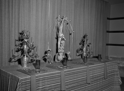 Mexican glass and tin suggest a travel theme in the table photographed, one of a dozen designed by Mrs. Alred McKnight for Mary Daggett Lake Day, held recently at the Garden Center. Pottery, figures, and birds made by the Mexican craftsmen are combined with bright colored flowers for the centerpiece, which is flanked by tin candelabra which simulate Christmas tree. Cloth and napkins are seersucker, in the Mexican national colors.