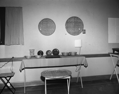 Image shows a display of woven baskets and pottery in a display at the "Useful Objects" exhibition that was held at the Fort Worth Art Association gallery at the Fort Worth Public Library. The show was arranged by Art faculty and students from North Texas State College (NTSC) in Denton. Published in the morning edition, April 23, 1950.