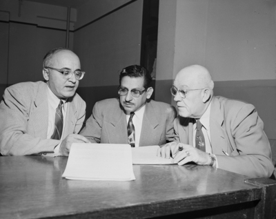 Waiting in 35th District Court at Brownwood for the start of the Saturday session in his trial for murder is Mario Sapet, flanked by his attorneys, Fred Semaan, left, and Lewis Schlesinger, both of San Antonio. The defendant is charged with the slaying of Jacob S. (Buddy) Floyd Junior in Alice September 8.