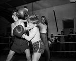 Joe Calderon, left, keeps a glove up in close action with Michael Keith at the Pee Wee Gloves Saturday night. Calderon, 54, won decision over Keith, 52. There is a referee in the ring, observing the match. There are people in the background watching as well.