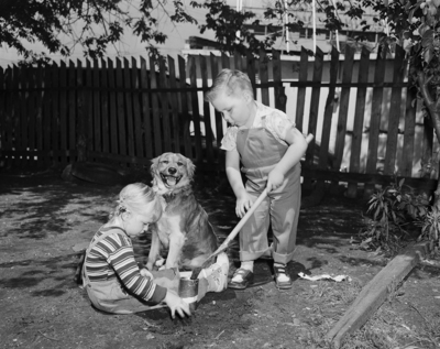 Confined to their backyard at 905 West, Weatherford, three-year-old Judy Warren, left, and Kenny Gossett, right, dig for worms while Kenny's dog Skipper sit beside them. Published in the evening edition, April 19, 1950.