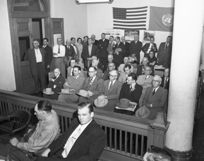 Commissioners Court room was crowded Saturday morning at a public hearing on a proposed small crimes court. In immediate foreground are Commissioner Wright, left, and Representative Smith. Among those attending were Judge McGregor of Criminal District Court, in dark suit, front row; Judge McGee of Criminal District Court No. 2, in center of spectators, and Robert L. Hoyt, president of the Tarrant County Crime Commission, standing at rear.