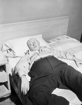 W. P. Foster, 73, chief turnkey at Tarrant County Jail who shot and killed 3 prisoners who were attempting to escape from jail. He suffered a wound in his left leg and is shown resting in bed. He has served in the Texas Prison System for 53 years and has foiled a number of prisons breaks in his career.