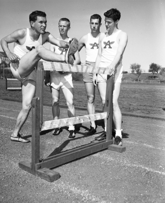 Here are four reasons why Arlington Heights is favored in the city track meet Friday night. While Bobby Cox limbers up, Joe B. Thompson, Dub Kendrick and Bo Wilbanks, left to right, looks on. All are expected to score points in the hurdles.
