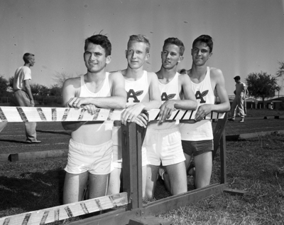 These four runners from Arlington Heights' own the best time among city schoolboys for the mile relay this year, a 3:33.9 effort that was good for second last Saturday in the North Texas Relays. Left to right, are Richard Clowe, Robert Clark, Randal Clark, and Jimmy Denton.