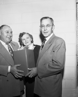 J. C. Gunter, right, mayor of Haltom City, and Mrs. Gunter were presented gifts Monday night. Here Jim McCoy, president of the Haltom City Civic League, presents a clock from his group.