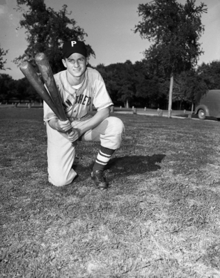 Image shows Paschal's center fielder, Homa Hill, Homa Hill is shown holding two baseball bats. There is a unidentified vehicle on the right.