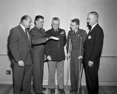 Fort Worth's 13 Lions Clubs started their blood donor drive Tuesday with the able assistance of these five, left to right, Charles M. Seymour, program chairman; Corporal Edward Lewis (holding one of 10,000 donor cards with his artificial arm); Major General Haydon L. Boatner, 1st Lieutenant Henry H. Peters, and Dr. W. J. Danforth, director of veterans affairs at the Chamber of Commerce. General Boatner, principal speaker, used Lewis and Peters, wounded Korean veterans, to illustrate the vital need for blood to save lives of fighting men.