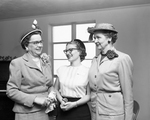 Mrs. E. L. Reid, left, of Cleburne, president of the conference of Women's Societies of Christian Service, and Mrs. George Sexton of Shreveport, Louisiana, right, welcome Mrs. John Bashom of Rice, youngest delegate, to a conference of the WSCS that opened Tuesday in Olney. Mrs. Sexton is a principal speaker at the meeting.