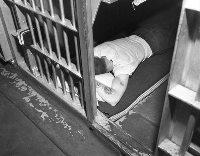 This prisoner on the fifth floor of the county jail is forced to sleep on the floor because of crowded conditions and broken bunks. Tank A, where this prisoner is held, was built to accommodate 14 men. Eighteen are quartered there now and it has held 21.