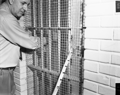 Chief Jailer John Dobson demonstrates how easy it is to gain access to outside windows at the county jail. He is shown poking his arm through the mesh which is supposed to guard a window on the fifth floor. In many cases the mesh is missing. Many of the windows are shattered.