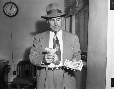 Detective S. P. Jones, with "weapon" and loot. Mrs. Helen Grubbs Meke used the toy gun in both robberies. Her method of operation was inconspicuous that other employees and customers were unaware of what was going on. She was however identified by the bank tellers at police headquarters.