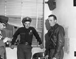 Motorcycle Officers P. T. Vaughan, right, and T. W. Curtis arrested Mrs. Helen Grubbs Mecke in the 1800 block of North Riverside Drive less than 30 minutes after she held up First National Bank of Handley. "Am I speeding?" the young mother asked them.