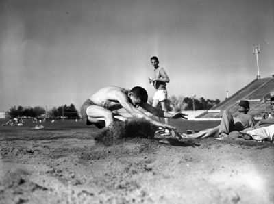 Arlington Heights' Ronnie White settles into the sand after a leap of 21 feet, 1 1/4 inches for first places in the broad jump of a tri-meet at Farrington Field Wednesday afternoon.