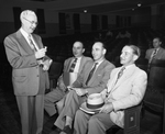 Using a bottle cork to put across his point during the second night session of his sales clinic here, Jack Lacy of Boston draws the attention of, left to right, Cecil Prinz, J. W. Henson and Glenn Smith. The sales clinic runs from March 24 to 27.