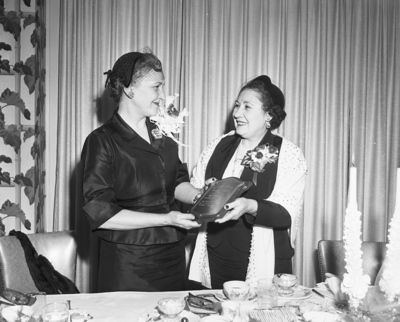 Mrs. A. Sidney Hill, left, receives the Zonta Club's plaque for service "above and beyond self" from its president, Mrs. Ruth Holland. Presentation was made at a dinner at Worth Hotel.