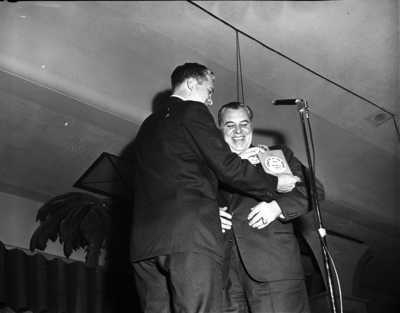 Spencer Harris, right, gets Gridiron's "chump of the year" award from Marvin Garrett for sticking around after being thrown to the baseball wolves here.