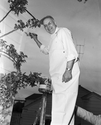 Artist Warner Sallman of Chicago, a painter of religious themes, is shown touching up the home of his son, Richard Sallman, of 856 North Bailey.