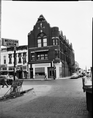 Extension shot of the Knights of Pythias Lodge Hall. Wide shot and far side showing the hall and showing more of the side streets.