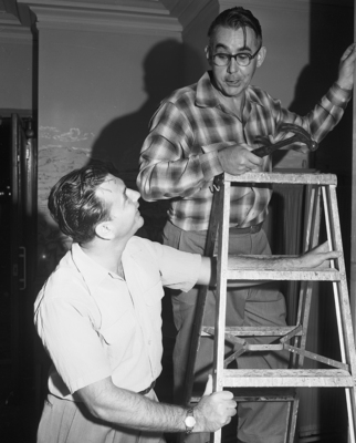Dr. George Pease, on the ladder, confers with Dr. Edward LaCroix on putting up booths in the Longhorn Room of Hotel Texas. These two men and other members of the Tarrant County Association of Osteopathic Physicians and Surgeons used hammers and saw in constructing the conference rooms for the Child Health Clinic.